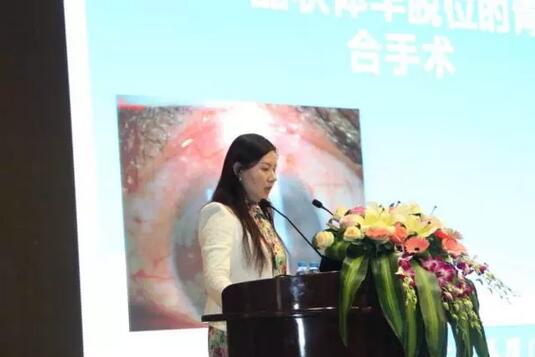 廈門大學(xué)附屬廈門眼科中心眼外傷學(xué)科帶頭人蔡錦紅主任在做“脈絡(luò)膜上腔出血的臨床治療選擇”報(bào)告。