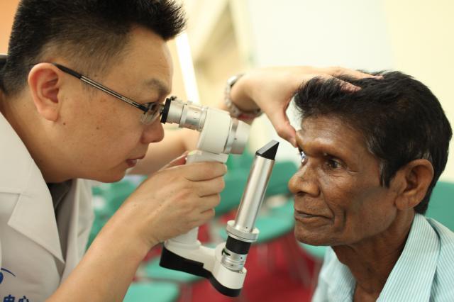 張廣斌在“湄公河光明行”中為患者進(jìn)行眼部檢查