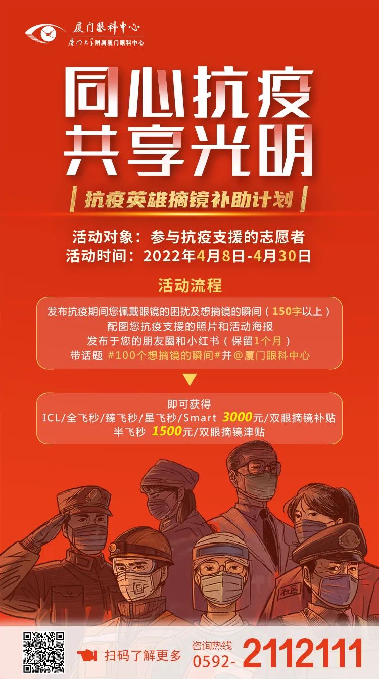 活動(dòng)內(nèi)容 :發(fā)布抗疫期間佩戴眼鏡的困擾及想摘鏡的瞬間(150字以上)發(fā)布于PYQ和小H書(shū)(保留1個(gè)月),配圖您抗疫支援的照片(2 張及以上)和本次活動(dòng)海報(bào),帶上話題#100個(gè)想摘鏡的瞬間,并@廈門眼科中心,即可獲得摘鏡補(bǔ)貼。