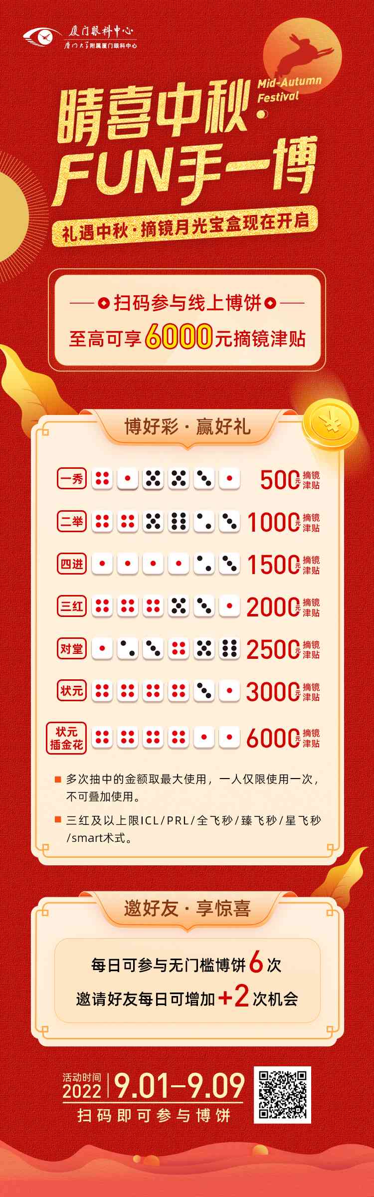 1、活動(dòng)期間,每人每天有6次博餅機(jī)會(huì),成功邀請一位好友參與博餅即可增加2次博餅機(jī)會(huì)。