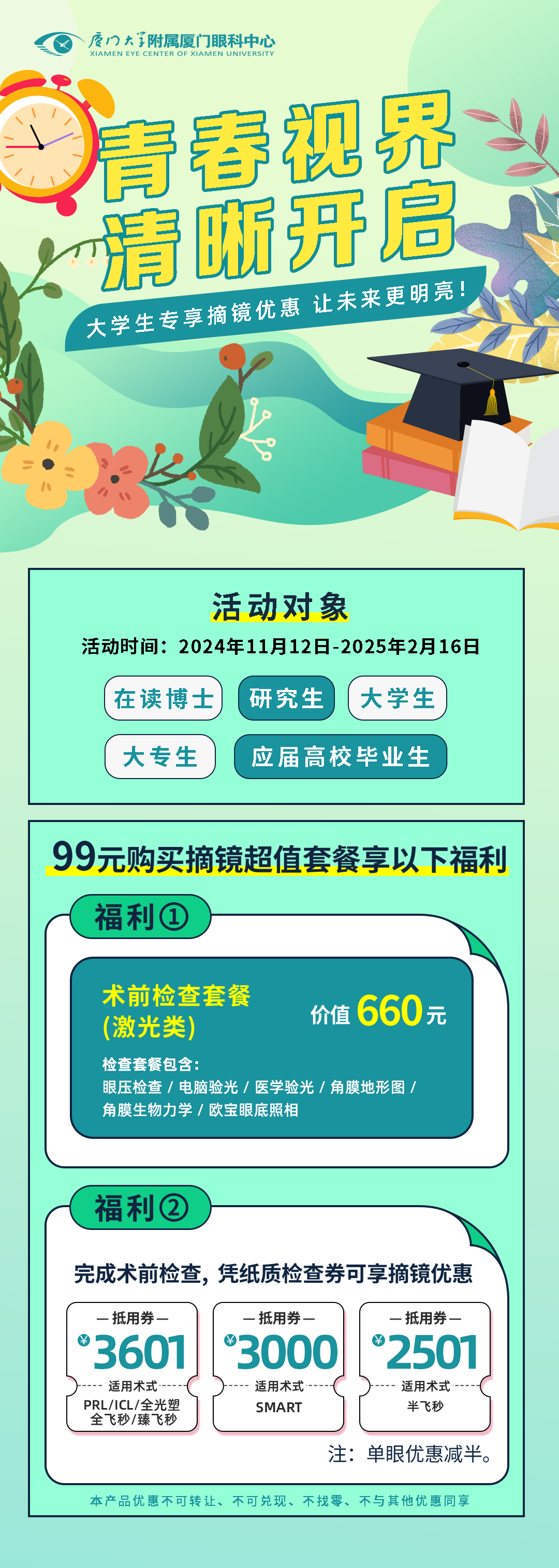 近幾年,大學(xué)生做近視手術(shù)已屢見不鮮,在走進(jìn)大學(xué)校園時(shí)或剛剛畢業(yè)準(zhǔn)備就業(yè)時(shí)選擇做近視手術(shù)仿佛已經(jīng)成為一種“風(fēng)尚”。那么身為“大學(xué)生”群體中的一員,做近視手術(shù)會(huì)不會(huì)有優(yōu)惠呢?近期不少福建大學(xué)生都在后臺(tái)留言。一起來看看吧!