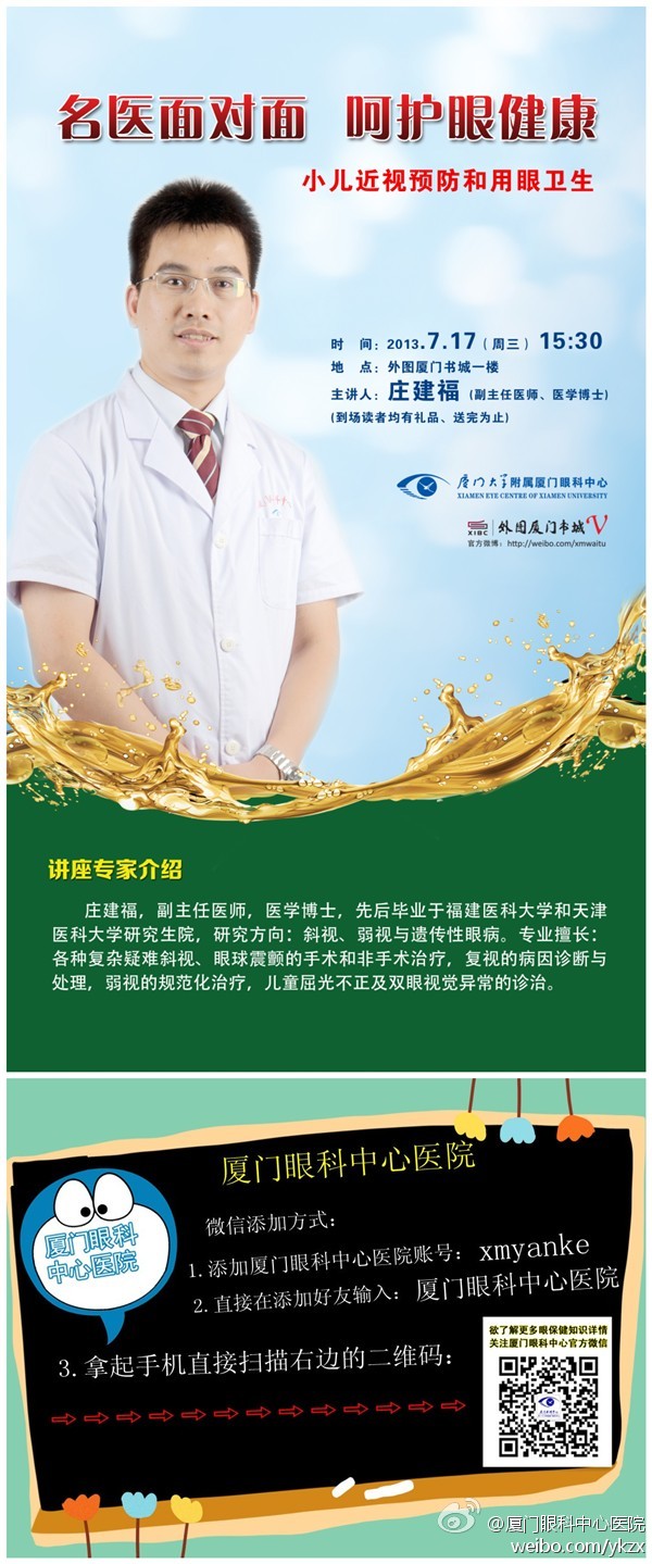 【文章導(dǎo)讀】2013年7月17日15:30分,廈門眼科中心小兒眼科莊建福博士將在外圖廈門書城一樓免費為青少年講述如何預(yù)防近視?,F(xiàn)場將還有免費禮品贈送。