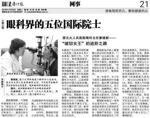 2018年10月30日,人民日報社屬報紙《健康時報》對廈門大學(xué)附屬廈門眼科中心總院長黎曉新進(jìn)行大篇幅報道。