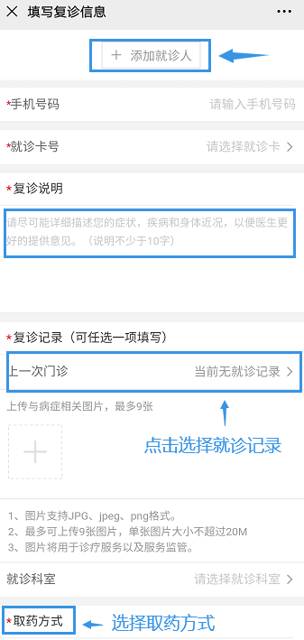填寫(xiě)就診人信息、復(fù)診說(shuō)明,對(duì)醫(yī)生詳細(xì)描述目前的癥狀;在復(fù)診記錄中,可以添加往期復(fù)診記錄,以便醫(yī)生快速了解病史