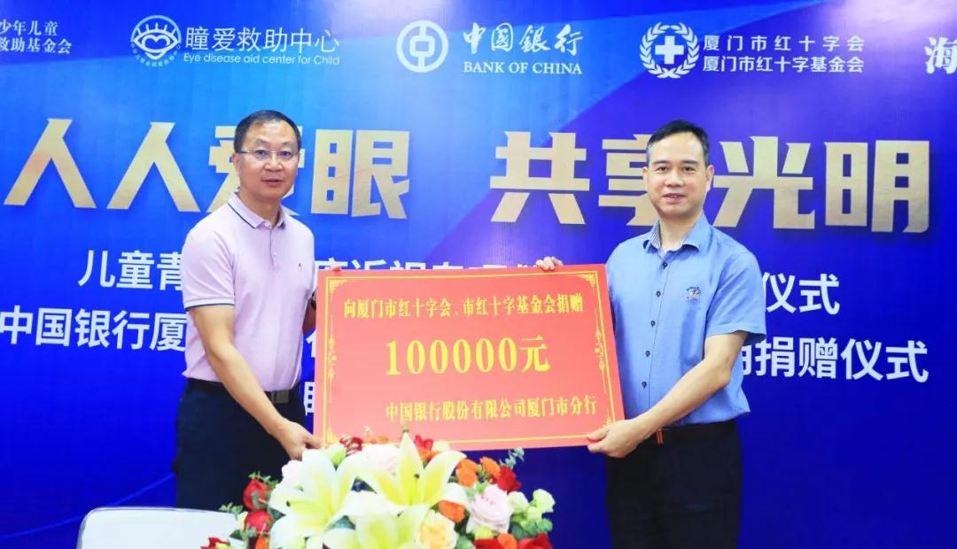 活動(dòng)當(dāng)天,還舉辦了中國(guó)銀行股份有限公司廈門市分行、廈門市紅十字會(huì)光明捐贈(zèng)儀式。中國(guó)銀行廈門分行積極擔(dān)當(dāng)社會(huì)責(zé)任、履行社會(huì)義務(wù),在愛(ài)眼日來(lái)臨之際,向廈門市紅十字基金會(huì)捐贈(zèng)10萬(wàn)元,用于困難眼疾患者的救助。