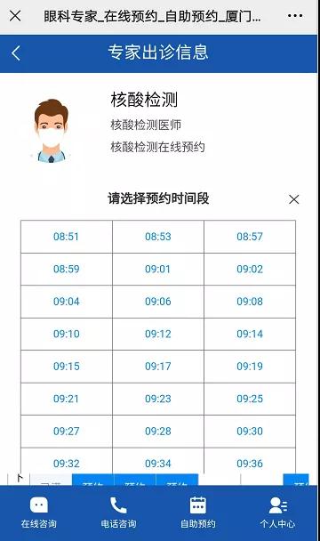 預(yù)約步驟:預(yù)約到診-核酸檢測預(yù)約-醫(yī)療機(jī)構(gòu)(廈門大學(xué)附屬廈門眼科中心)-選擇思北/五緣院區(qū)-選擇時(shí)間預(yù)約