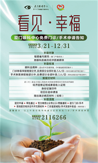 眼睛是心靈之窗,眼健康是國民健康的重要組成部分,也是反映人民群眾健康和幸福指標(biāo)的一面鏡子。為深化落實(shí)“愛心廈門”行動(dòng)及內(nèi)涵,提升人民群眾的獲得感、幸福感、安全感,滿足普遍、多樣的眼健康需求,2022年3月21日至12月31日,廈門眼科中心暖心啟動(dòng)2022年“看見幸福”眼健康愛心公益項(xiàng)目,聚焦弱勢群體及重點(diǎn)眼病的困難救治,凡符合條件的患者均可申請專項(xiàng)愛心公益補(bǔ)助。