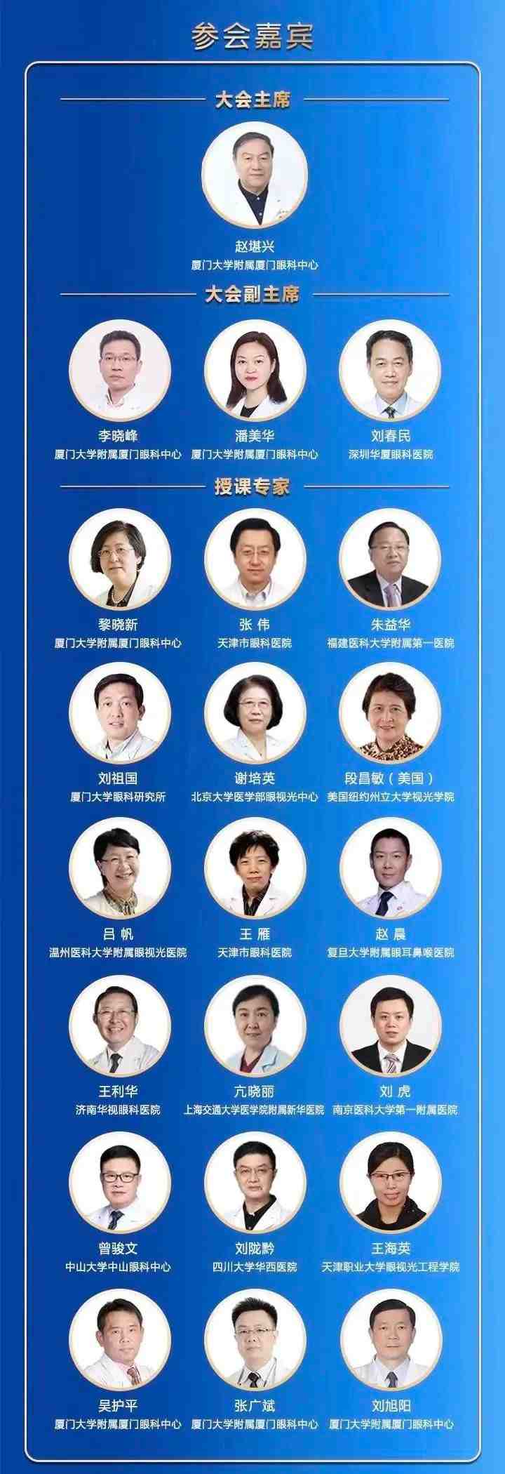 授課專(zhuān)家包括國(guó)際眼科科學(xué)院院士、亞太地區(qū)斜視與小兒眼科學(xué)會(huì)副主席趙堪興教授;國(guó)際眼科科學(xué)院院士、廈門(mén)眼科中心總院長(zhǎng)黎曉新教授;中華醫(yī)學(xué)會(huì)眼科學(xué)分會(huì)斜視與小兒眼科學(xué)組組長(zhǎng)張偉教授;中華醫(yī)學(xué)會(huì)眼科學(xué)分會(huì)眼視光學(xué)組組長(zhǎng)呂帆教授;以及朱益華教授、劉祖國(guó)教授、王利華教授、段昌敏教授(美國(guó))、謝培英教授、王雁教授、亢曉麗教授、趙晨教授、劉虎教授、劉隴黔教授、曾駿文教授、潘美華教授、張廣斌教授、吳護(hù)平教授、劉旭陽(yáng)教授、王海英教授等重量級(jí)業(yè)界專(zhuān)家和講者。