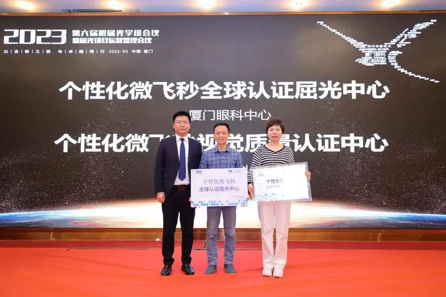 ▲ 愛(ài)爾康屈光產(chǎn)品事業(yè)部負(fù)責(zé)人王炯先生為廈門眼科中心頒發(fā)”個(gè)性化微飛秒全球認(rèn)證屈光中心“。