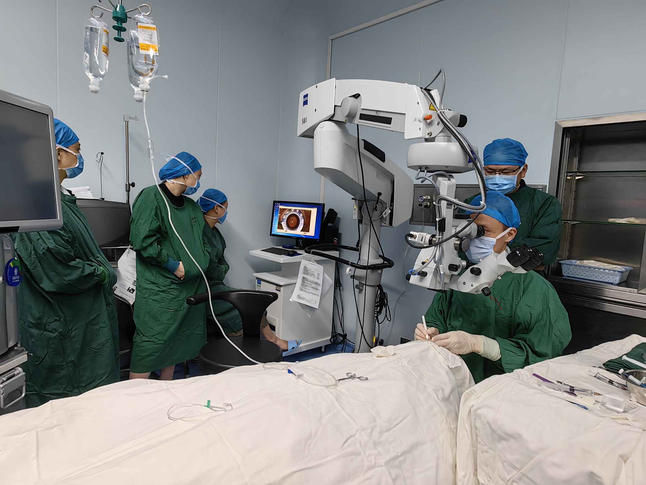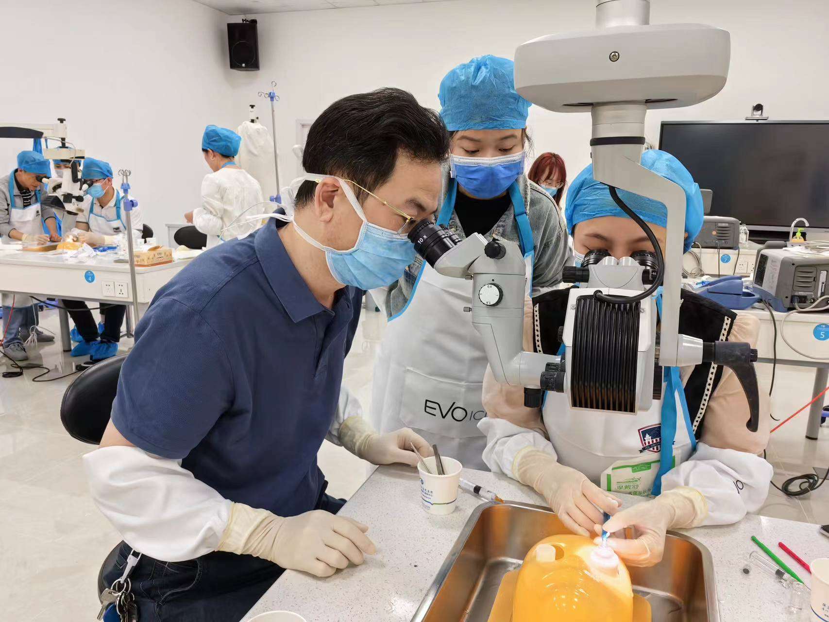 手術(shù)觀摩環(huán)節(jié),劉才遠(yuǎn)教授、鄭林主任對(duì)學(xué)員們進(jìn)行一對(duì)一手術(shù)技巧的帶教操作指導(dǎo)。他們不僅是國內(nèi)為數(shù)不多ICL手術(shù)經(jīng)驗(yàn)豐富的專家,還是各地ICL手術(shù)醫(yī)生的帶教、培養(yǎng)及考核導(dǎo)師。