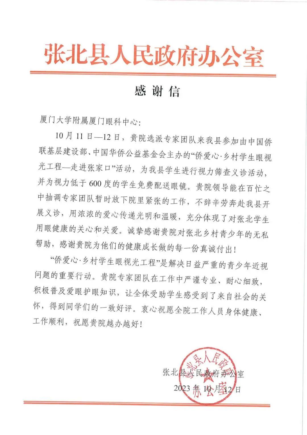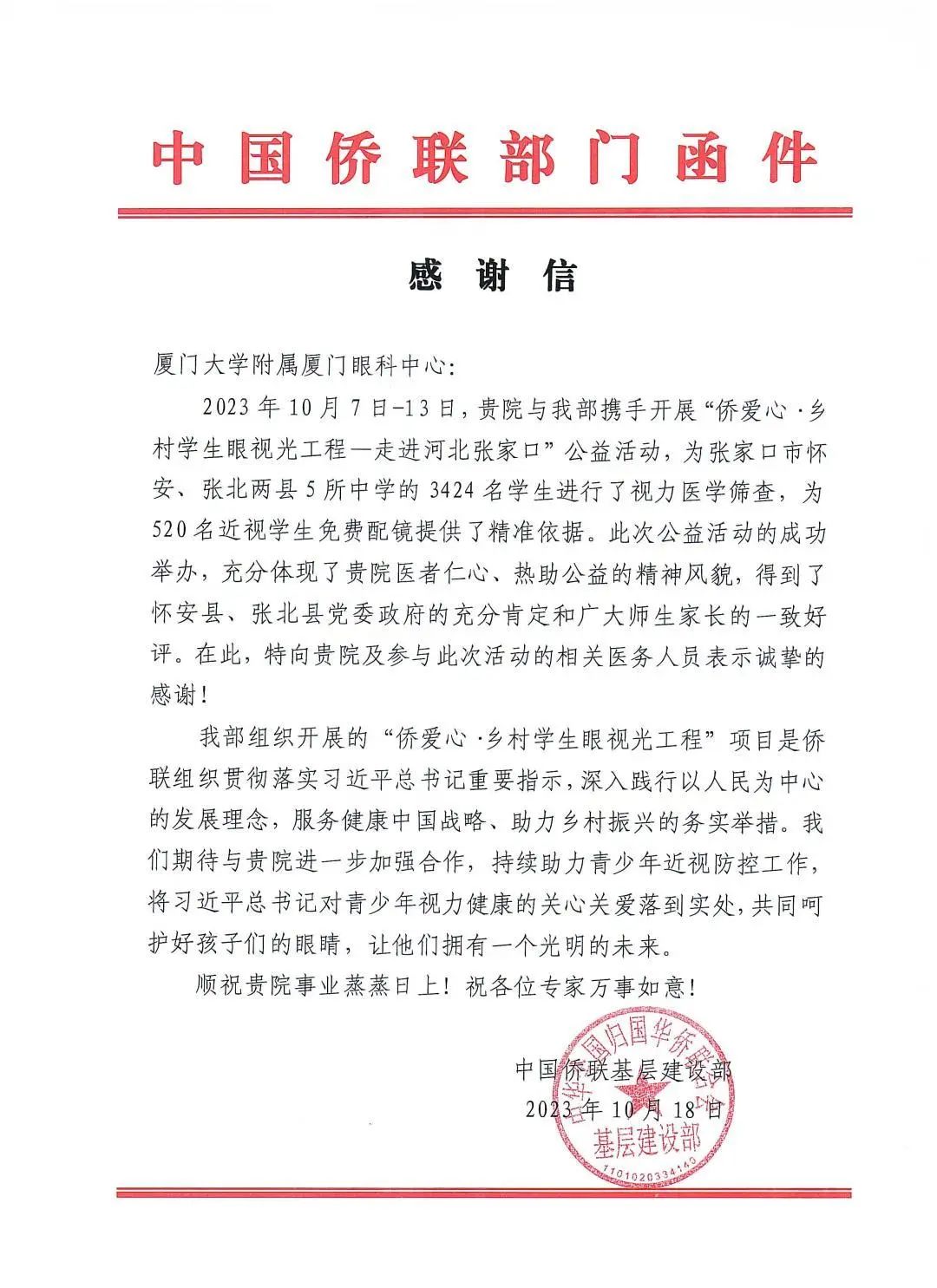 近日,廈門眼科中心接連收到來自中國僑聯(lián)基層建設(shè)部、懷安縣和張北縣人民政府辦公室的三封感謝信,信中對廈門眼科中心在“僑愛心·鄉(xiāng)村學(xué)生眼視光工程-走進(jìn)河北張家口”公益活動中的無私付出及對鄉(xiāng)村孩子的寶貴的幫助給予充分認(rèn)可與真摯感謝。