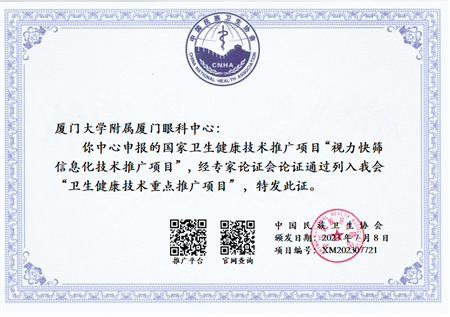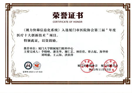11月25日,在廈門市醫(yī)院協(xié)會第三屆年會暨“學科引領(lǐng)高質(zhì)量發(fā)展”學術(shù)會議上,廈門大學附屬廈門眼科中心“視力快篩信息化系統(tǒng)”榮獲廈門市醫(yī)院協(xié)會第三屆“年度醫(yī)療十大創(chuàng)新技術(shù)”項目,同時“視力快篩信息化技術(shù)推廣項目”經(jīng)國家衛(wèi)生健康技術(shù)應用推廣項目專家論證會論證,成功入選中國民族衛(wèi)生協(xié)會2023年度“衛(wèi)生健康技術(shù)重點推廣項目”。