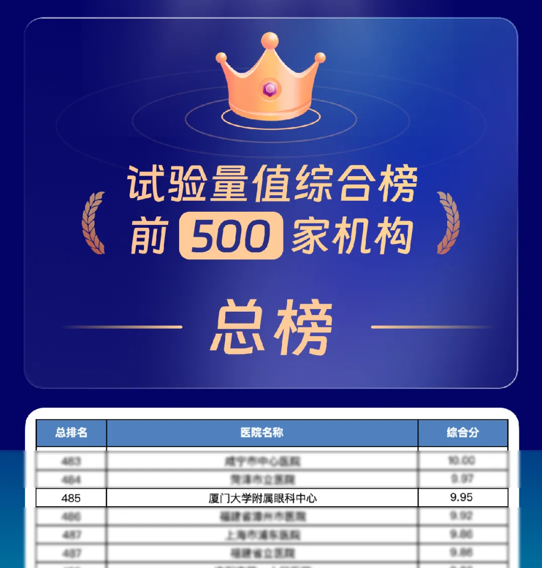 近日,新一年度的《全國GCP機構(gòu)藥物臨床試驗量值排行榜》正式發(fā)布,廈門眼科中心再次入列全國排行榜單!